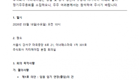 지티에이컴 주주총회 소집공고 - 현 대표이사 임기 연장건